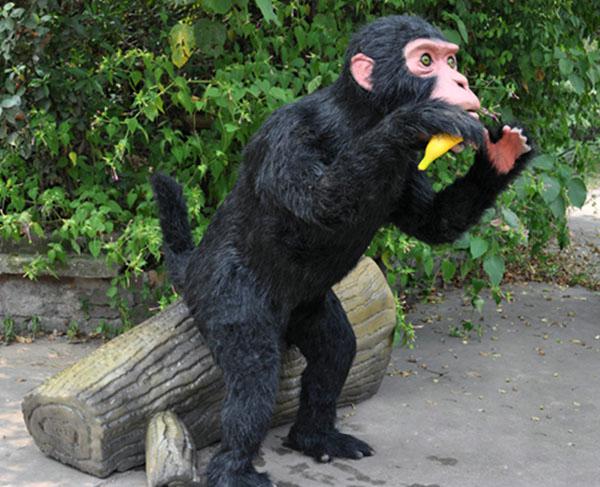 1比1仿真电动机械硅胶贴毛猴子模型可爱的猴子宝贝正座在木桩上,两眼眺望远处像看见了什么让人惊奇的事。手上正拿着它最喜欢吃小香蕉,是不是超级可爱呀。