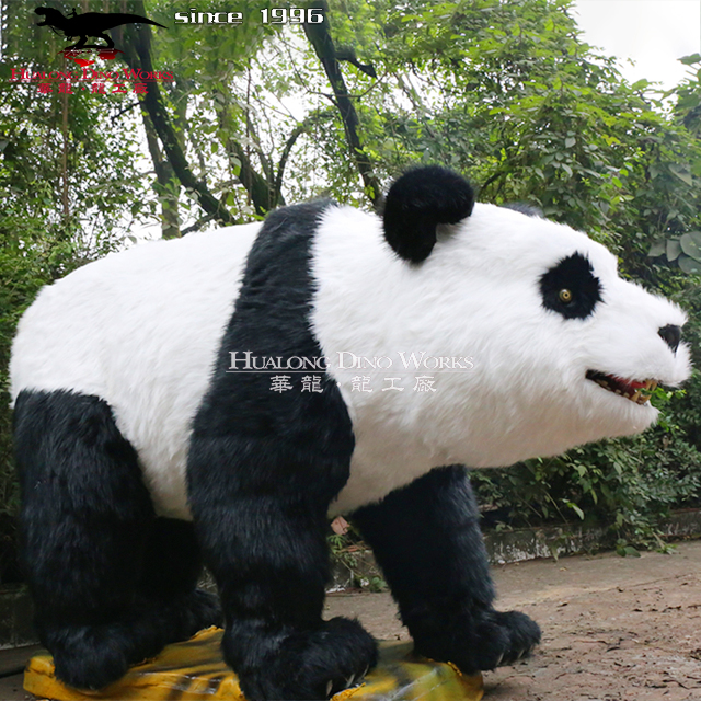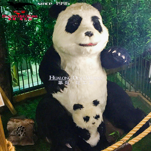 仿真贴毛大熊猫组合加小熊猫宝宝,内部采用钢结构造型、直流电机控制动作、表皮采用高密度海绵,手工造型、刻模、外植胶皮、