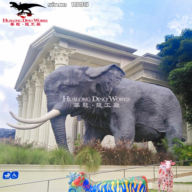 真大象还原惟妙惟肖的大象,以钢材作为结构,用高密度海绵塑形,以硅胶和纤维作为皮肤,用颜料喷绘成大象的颜色。