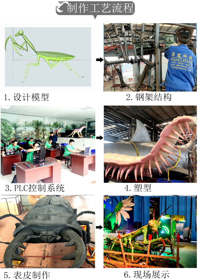 制作工艺:内部采用钢结构造型、直流电机控制动作、表皮采用高密度海绵,手工造型、刻模、外植胶皮、喷涂色彩,产品形象生动、逼真,动作灵活、自然,防水,防冻,抗高温功效。