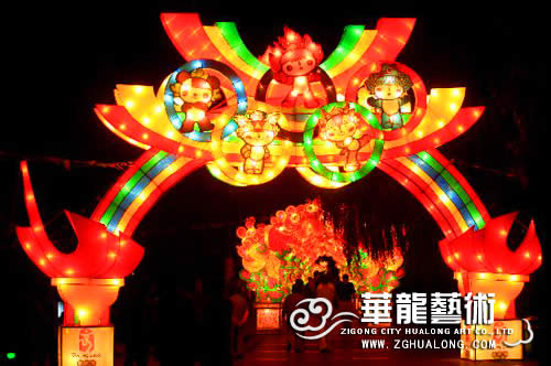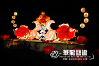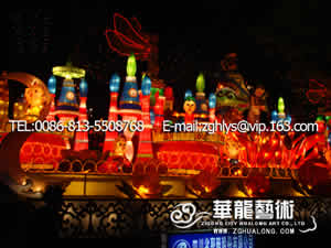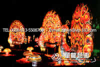 彩灯制作:钢架结构,丝架造型 部分LED 勾边 立体造型 彩色绸缎分色裱糊 美术处理 造型美观绚丽多姿