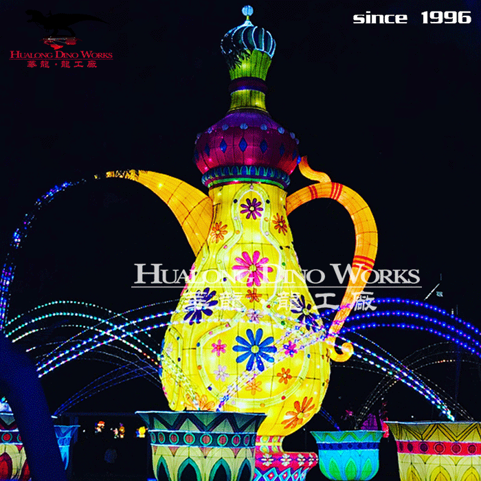 彩灯制作:钢架结构,丝架造型 部分LED 勾边 立体造型 彩色绸缎分色裱糊 美术处理 造型美观绚丽多姿