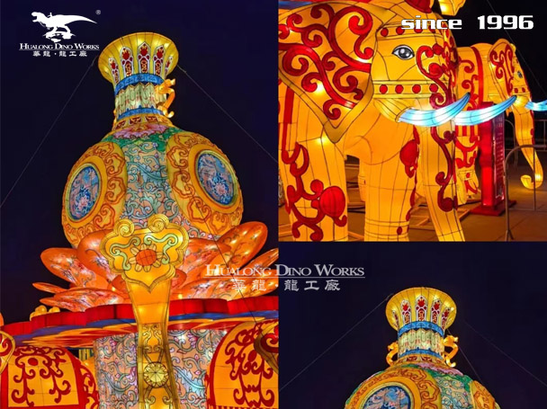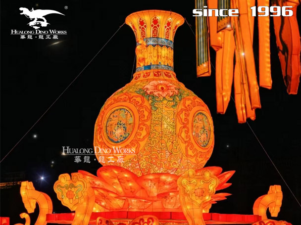 彩灯制作:钢架结构,丝架造型 部分LED 勾边 立体造型 彩色绸缎分色裱糊 美术处理 造型美观绚丽多姿
