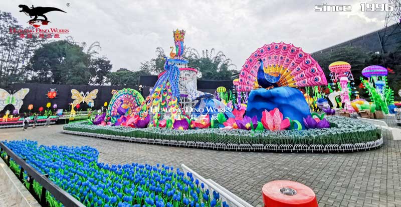 彩灯制作:钢架结构,丝架造型 部分LED 勾边 立体造型 彩色绸缎分色裱糊 美术处理 造型美观绚丽多姿