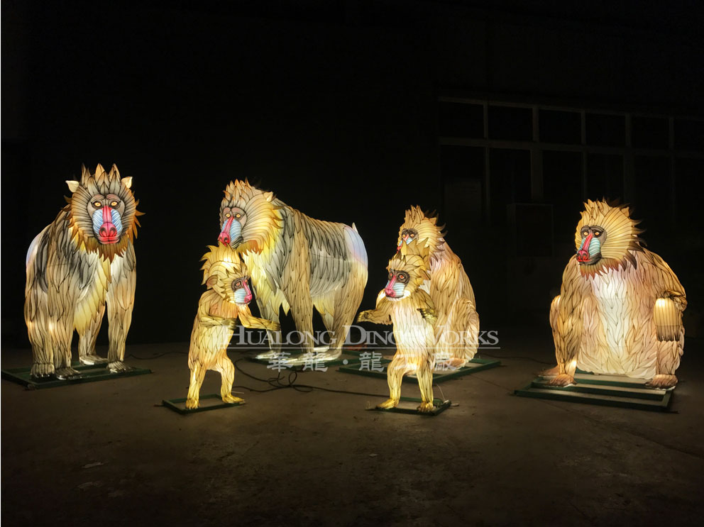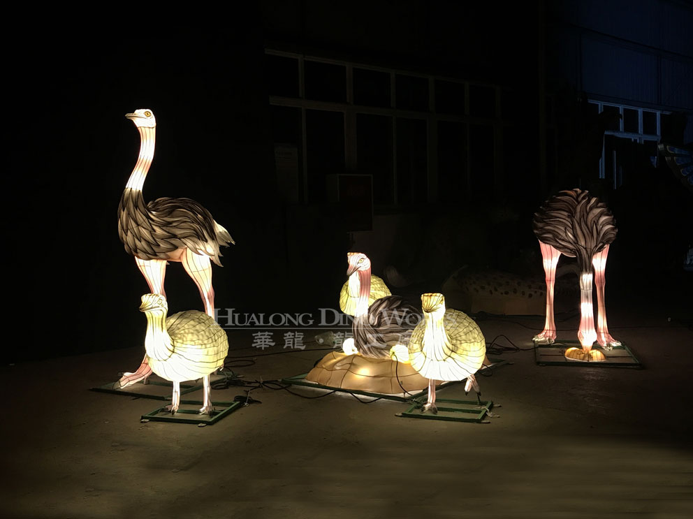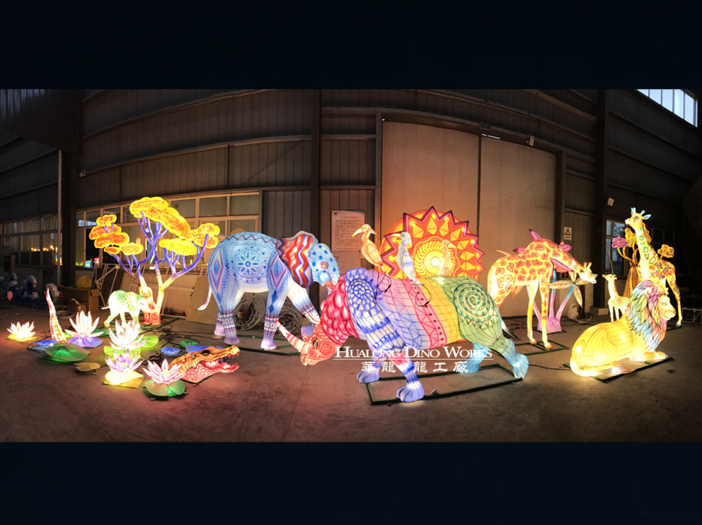 动物彩灯制作:钢架结构,丝架造型 部分LED 勾边 立体造型 彩色绸缎分色裱糊 美术处理 造型美观绚丽多姿