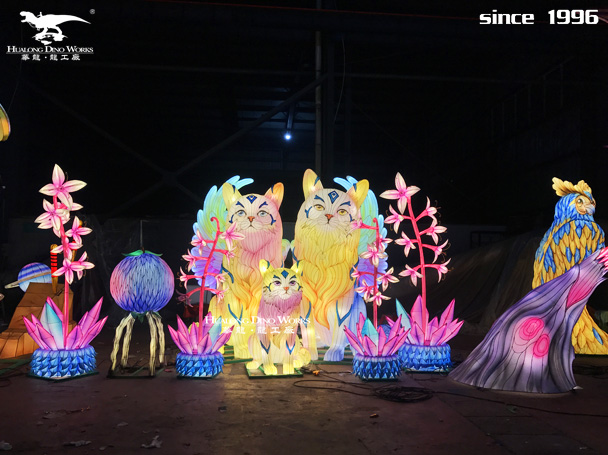 动物彩灯制作:钢架结构,丝架造型 部分LED 勾边 立体造型 彩色绸缎分色裱糊 美术处理 造型美观绚丽多姿