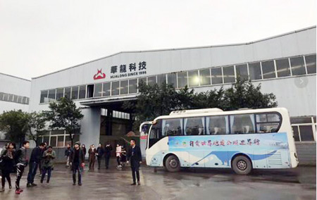 早上9:00, 一辆满载世界地质公园专家和国内外十多家媒体的大巴车缓缓驶入华龙.龙工厂---仿真恐龙制作基地。