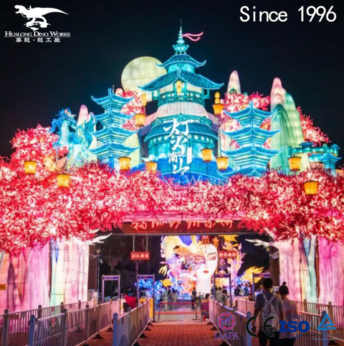 23年8月在长沙橘子洲头一个富有特色的乐园开业了——灯火南山国潮音乐灯展。灯火南山取谐音灯火阑珊,出自《青玉案·元夕》“众里寻他千百度。蓦然回首,那人却在灯会阑珊处。自贡华龙科技有限公司派出200余名专业的工作人员到现场进行灯展的制作,由于时间要求华龙人夜以继日顶着40度的高温在户外持续作业,最终在甲方规定时间完成了这场盛大的灯光秀。